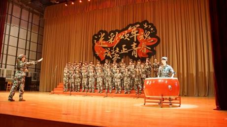 学子们从一次又一次的辛勤排练到舞台上的全力以赴,嘹亮振奋的《中国军魂》和《精忠报国》响彻礼堂、振奋人心。