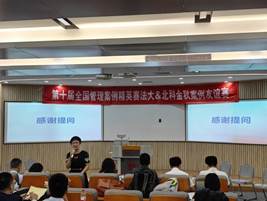 企业案例研究中心主任戴建华教授进行会议致辞。他指出此次法大&北科友谊赛是对即将到来的区域赛的友好模拟赛,并介绍了两校之间“君住学院南,我住学院北”的缘分和友谊,最后戴老师对本次参赛的两支队伍今日和之后区域赛的表现表示期待。
